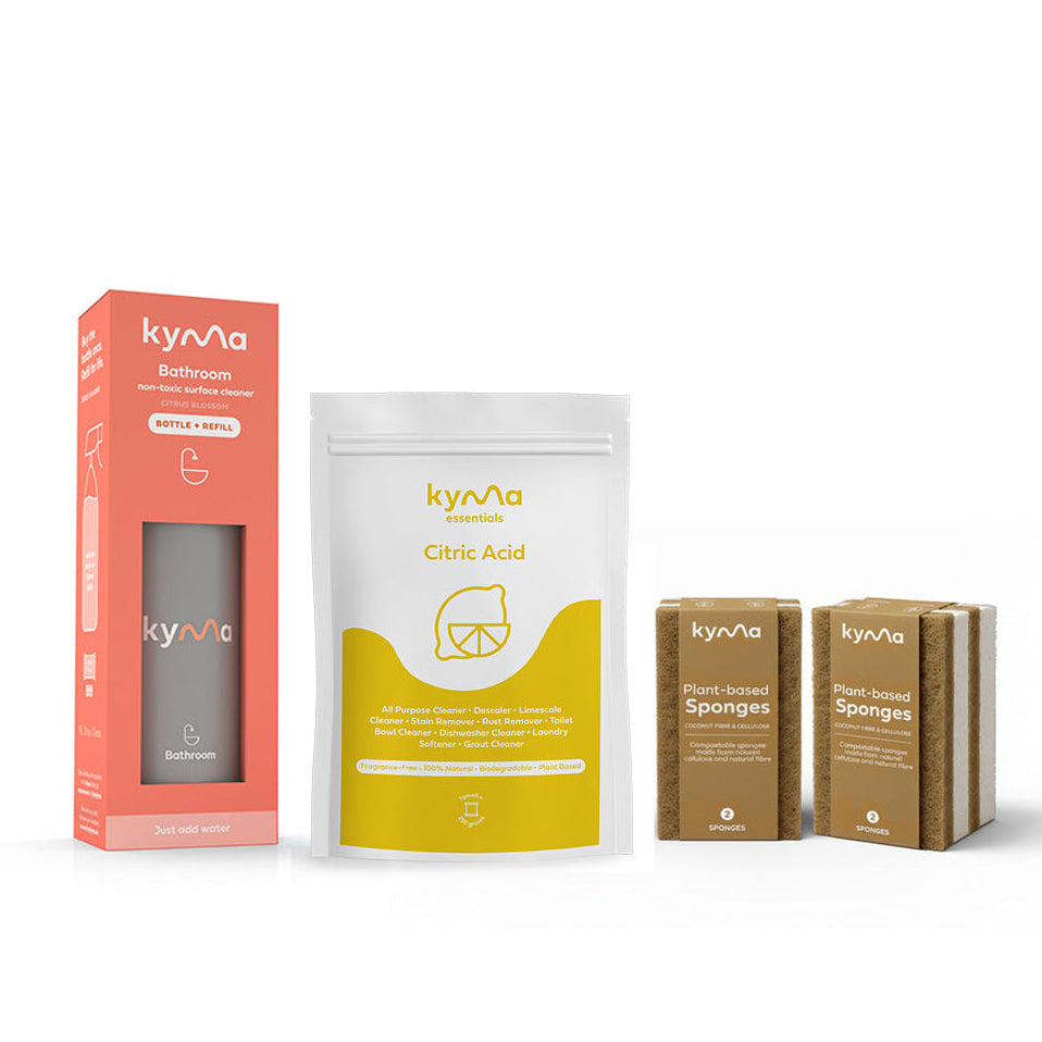 يعملان معًا على إزالة التكلسات، البقع، وتراكم الأوساخ اليومية بفعالية، مع ترك الحمّام نظيفًا ومنتعشًا بعطر خفيف. وبفضل إسفنجات جوز الهند والسليلوز القابلة للتحلل، توفّر لك هذه المجموعة تنظيفًا عمليًا وآمنًا من دون مواد كيميائية قاسية