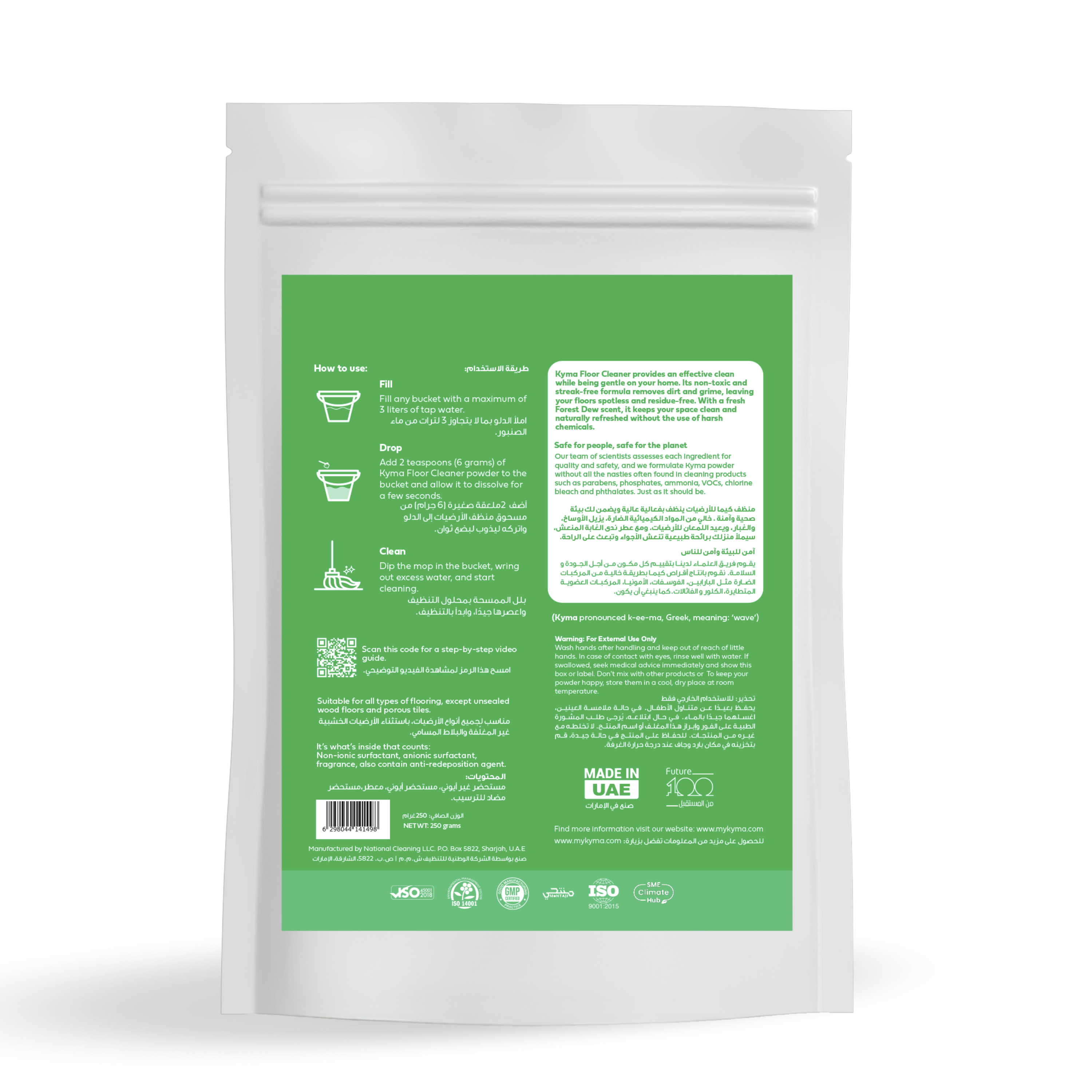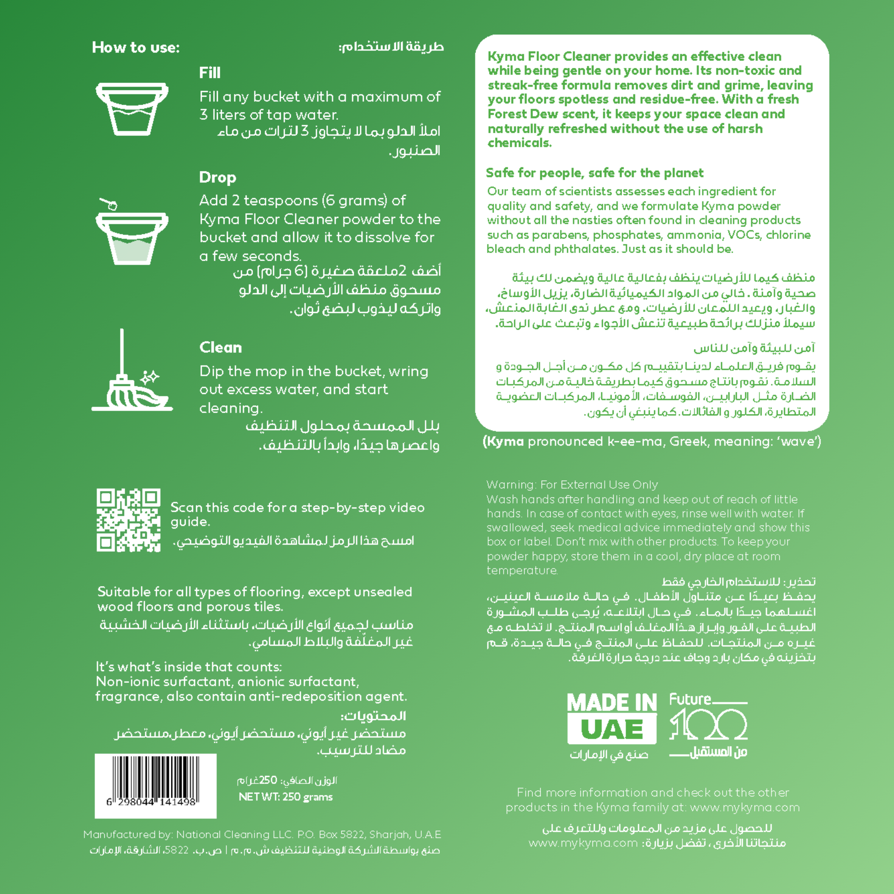 منظف كيما للأرضيات ينظف بفعالية عالية ويضمن لك بيئة صحية وآمنة . خالي من المواد الكيميائية الضارة، يزيل الأوساخ، والغبار، ويعيد اللمعان للأرضيات. ومع عطر ندى الغابة المنعش، سيملأ منزلك برائحة طبيعية تنعش الأجواء وتبعث على الراحة.